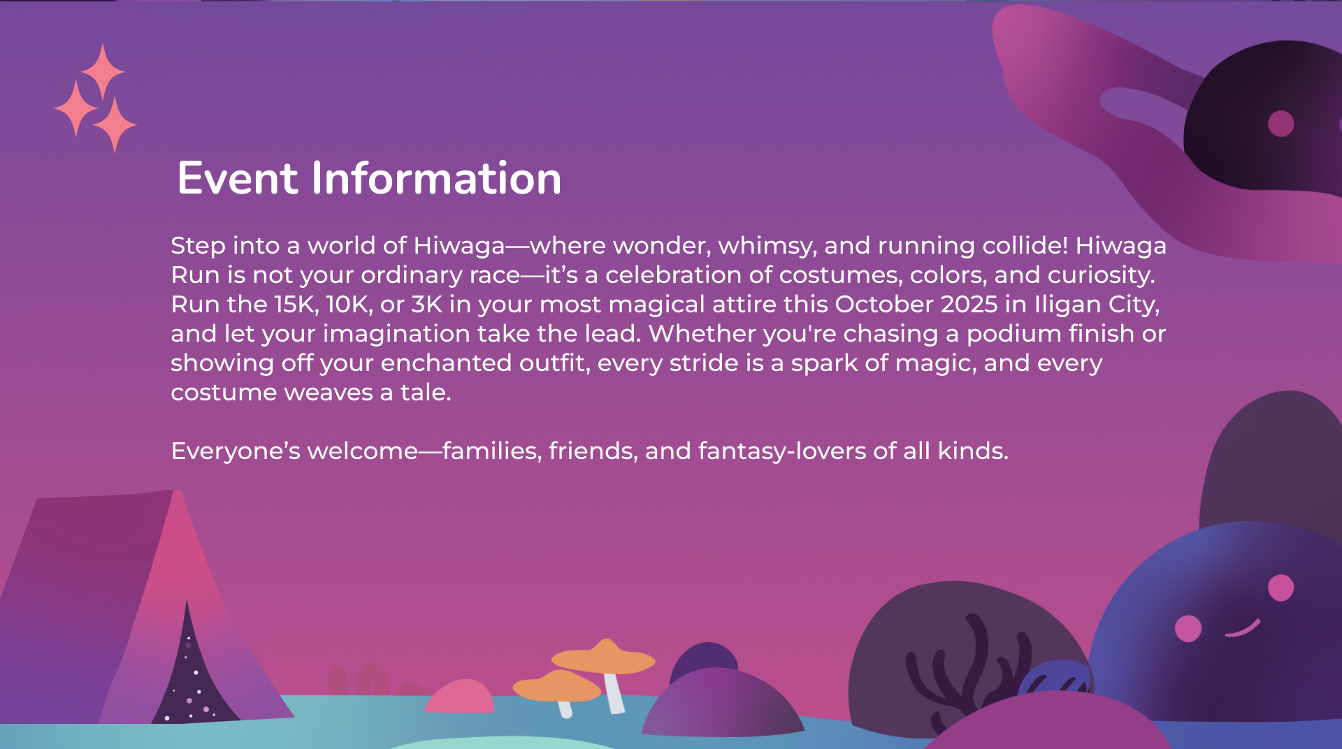 Step into a world of Hiwaga—where wonder, whimsy, and running collide! Hiwaga Run is not your ordinary race—it’s a celebration of costumes, colors, and curiosity. Run the 15K, 10K, or 3K in your most magical attire this October 2025 in Iligan City, and let your imagination take the lead.
